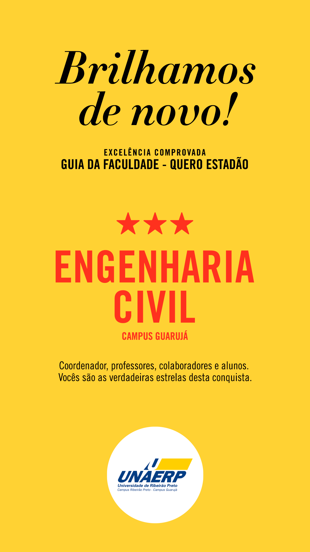 "A carreira do Engenheiro Civil é de suma importância. Com o seu conhecimento, avalia, projeta e constrói diversos lugares, lidando diretamente com vidas, sonhos e qualidade de vida. Sempre admirei a profissão, e a Unaerp me possibilitou realizar meu sonho profissional."