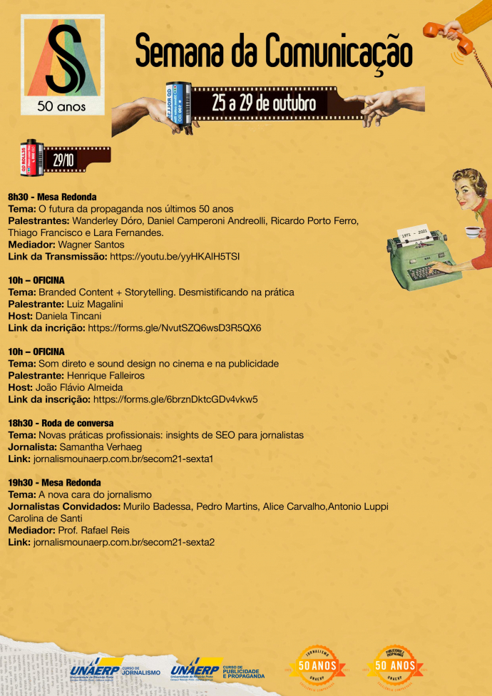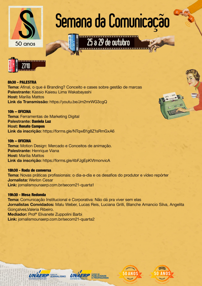 Por canais digitais, a Semana começa na segunda, 25, às 19h30, com um Sarau Cultura apresentando música, livro-reportagem, poemas, memórias. Também são egressos do curso as estrelas do show. A partir de terça, 26, no período da manhã, às 8h30, a programação é de Publicidade e Propaganda, trazendo convidados como Wanderley Doro, formado na primeira turma do curso e que entre leões de ouro, bronze e prata em Cannes também ganhou o Clio de Nova York.