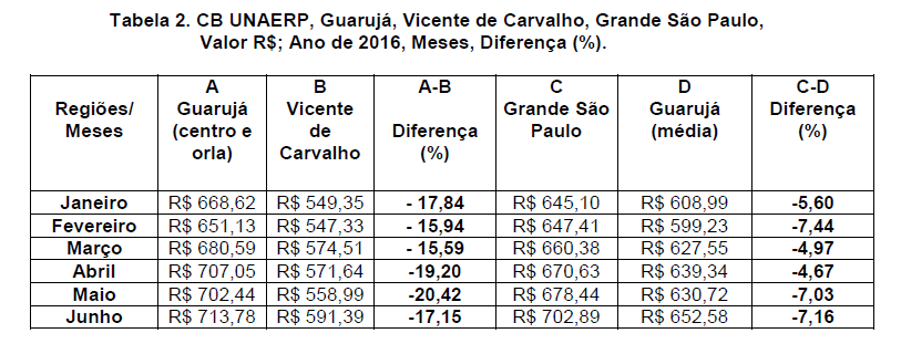 Na comparação de preços dentro da cidade, o valor da Cesta Básica de Vicente de Carvalho foi menor do que o valor da Cesta Básica de Guarujá – (Centro e Orla). A menor diferença de preços foi observada no mês de março, com –15,59% e a maior diferença entre os valores foi no mês de maio, com –20,42% (ver tabela 2).