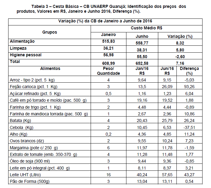 O aumento médio de preços da Cesta Básica de Guarujá (Centro e Vicente de Carvalho) durante o primeiro semestre de 2016 foi de 7,16%, sendo que o valor da CB com os novos produtos foi de R$ 608,99 em janeiro e de R$ 652,58 em junho na cidade de Guarujá. Esse acréscimo de preços foi acima da inflação, sendo que o IPCA (IBGE), no primeiro semestre de 2016, teve acumulo de 4,42%. Isso é o que revela a pesquisa realizada pelo Núcleo de Pesquisas Fernando Lee, da UNAERP Guarujá.
