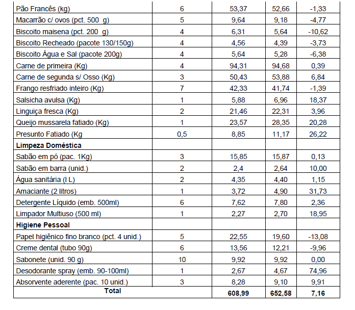 No período estudado, o grupo dos alimentos que apresentou a maior alta, foi a alimentação, com 8,32%; o grupo de limpeza aumentou 5,80% e o de higiene pessoal teve uma redução de –2,60% e no geral houve um aumento médio de preços de 7,16% no semestre.