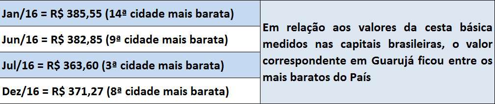 Os dados compilados do ano de 2016 são da pesquisa da Cesta Básica de Guarujá divulgados pelo Núcleo de Pesquisas Fernando Eduardo Lee da UNAERP Guarujá. No estudo, são medidos os preços de 13 (treze) produtos especificados pelo DIEESE, os principais do consumo do brasileiro.