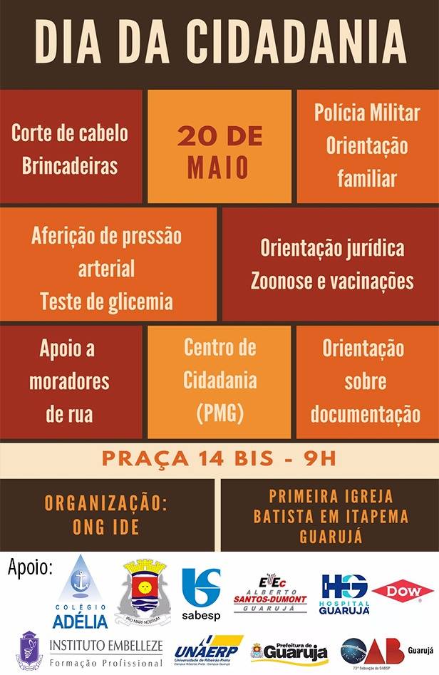 Além das atividades de saúde, o evento contará com vários serviços à comunidade, como corte de cabelo, orientação familiar, orientação jurídica, atividades do centro de cidadania, entre outros. A atividade é organizada pela ONG IDE (Itapema Desenvolvendo Esperança) e Primeira Igreja Batista em Itapema – Guarujá (PIBIG), com apoio de várias entidades e da Prefeitura de Guarujá.