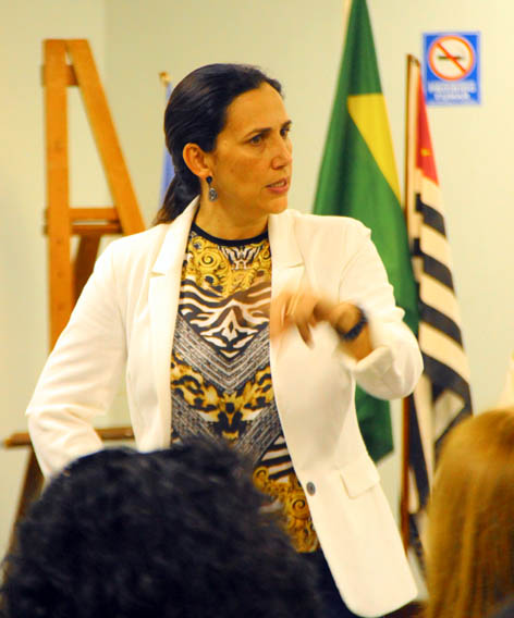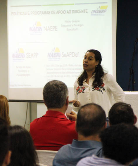 A profa. Fabiana Henriques prestou explicações sobre o trabalho do SEAPP – Serviço de Apoio Psicológico e Psicopedagógico e do SEAPDEf – Serviço de Apoio à pessoa com Deficiência, que integram o NAEPE – Núcleo de Apoio Educacional e Psicológico Especializado.