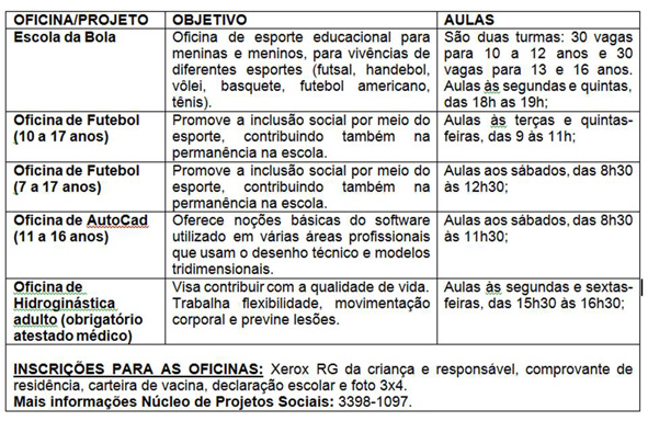 O Núcleo de Projetos Sociais mantém várias oficinas gratuitas à comunidade voltadas a crianças, jovens, adultos e pessoas da terceira idade em projetos de cunho cultural, esportivo e de capacitação. Neste segundo semestre, algumas oficinas estão com inscrições abertas: