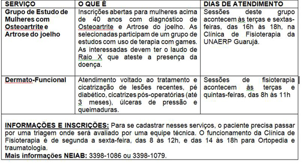 Duas áreas de atendimento da Clínica de Fisioterapia estão com inscrições abertas para novos pacientes: o serviço de Dermato-Funcional (cicatrização e prevenção de lesões e feridas) e o grupo de mulheres com Osteoartrose e Artrose do joelho. A Clínica de Fisioterapia oferece ainda atendimentos gratuitos em Ortopedia, Traumatologia, Reumatologia e Neurologia Adulto. Para se cadastrar, os pacientes precisam passar por uma triagem.