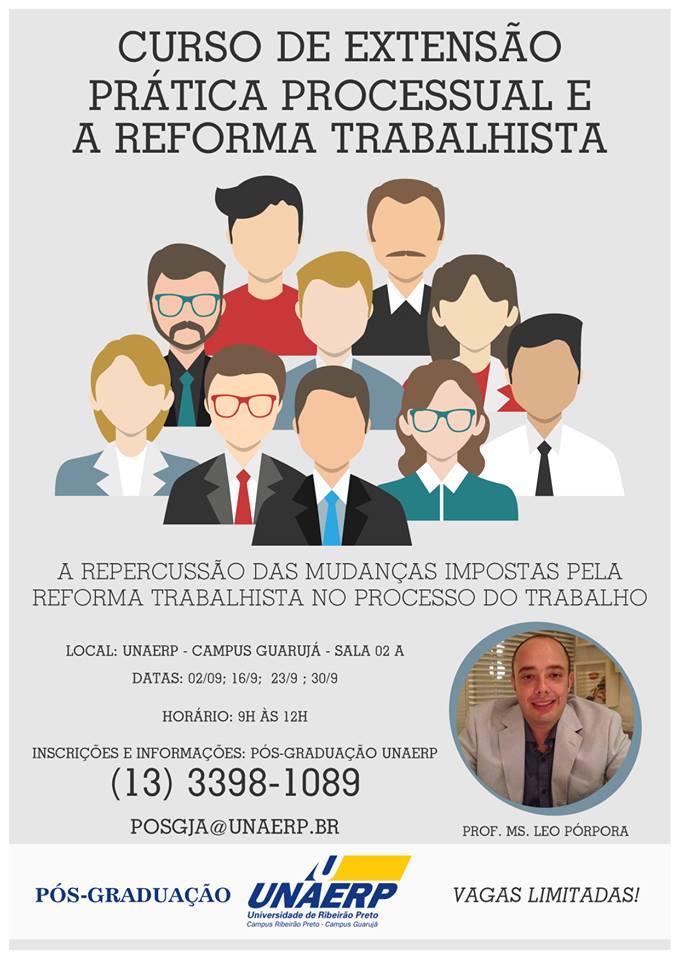 A UNAERP Guarujá está com inscrições abertas para o curso de Extensão “Prática Processual e a Reforma Trabalhista”. O curso com duração de 12h, divididas em quatro sábados, trará um panorama das mudanças impostas pela reforma trabalhista no Direito Processual do Trabalho.