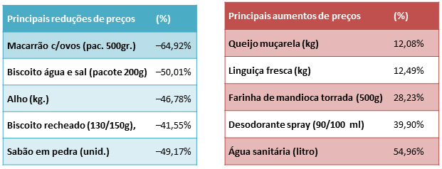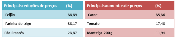 E dos trezes produtos que compõem a CBN de Guarujá, nove apresentaram redução nos preços, com as maiores quedas no feijão (-38,89%), farinha de trigo (-38,17%) e pão francês (-23,87%). Já a carne (35,36%), o tomate (17,48%) e a manteiga (11,94%) foram os itens que mais tiveram aumento de preço.