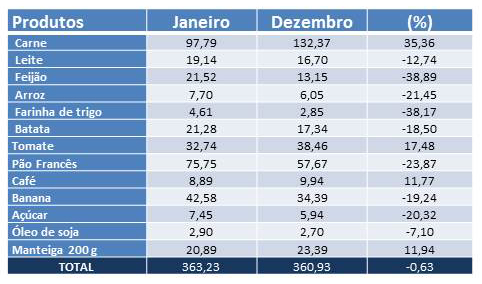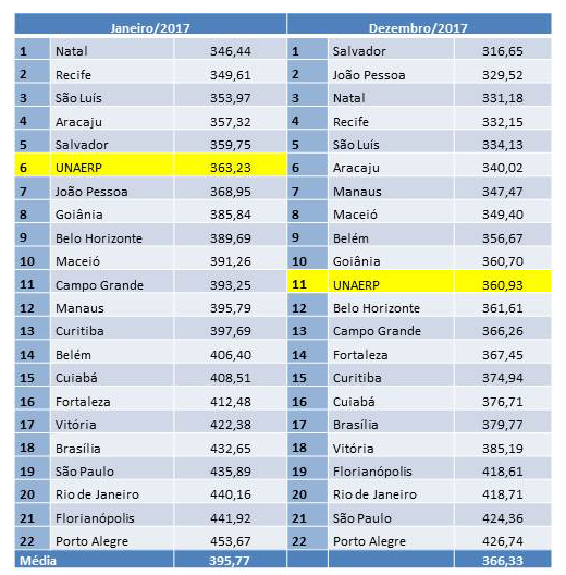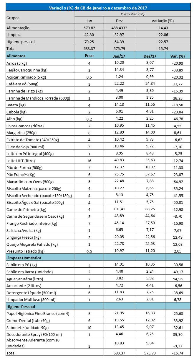 Confira aqui a tabela completa de preços levantados pela pesquisa CB UNAERP nos meses de janeiro e dezembro/2017 e a variação (em %).