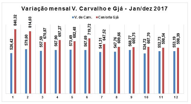 Outro dado da pesquisa CB UNAERP é a indicação dos preços nas duas regiões da cidade: a região central (que compreende centro/orla) e o distrito de Vicente de Carvalho. Durante o ano de 2017, os valores da CB em Vicente de Carvalho ficaram abaixo dos preços da CB de Guarujá, sendo que a maior variação percentual foi de 59,63%, em janeiro de 2017 e a menor foi em setembro, com 6,50%. Na média, a variação de preços entre as duas regiões foi de 21,48%.