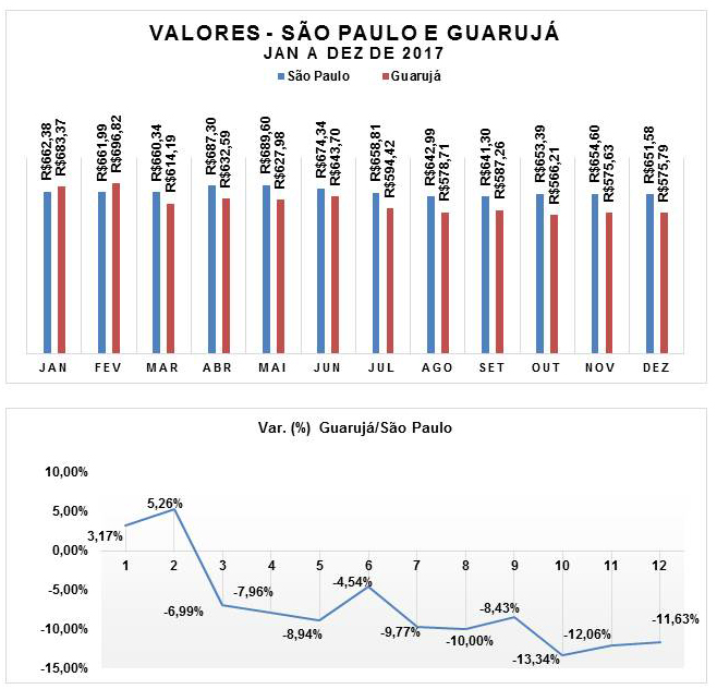 A pesquisa CB UNAERP também compara os preços praticados no município de Guarujá (média) com os números aferidos na capital São Paulo. Exceto em janeiro e fevereiro de 2017, nos demais meses Guarujá teve cesta básica mais barata que a capital paulistana, com destaque para o mês de outubro, com variação de –13,34%. Na média, a CB da capital São Paulo registrou o valor de R$ 661,55 e a CB UNAERP R$ 614,72, uma diferença negativa de –7,08%, representando uma economia de R$ 46,83.