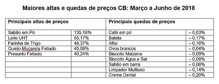 A Cesta Básica CB UNAERP registrou alta de 15,64% no segundo trimestre de 2018 na cidade de Guarujá, passando de R$ 560,45 em março para R$ 648,11 em junho. Embora o aumento de preços tinha sido observado nos três grupos de produtos, a maior alta foi entre os itens de Limpeza (52,58%), e o destaque foi o sabão em pó que subiu 135,16% nesse período. Ainda assim, os preços praticados em Guarujá ficaram mais baixos que em São Paulo (capital).