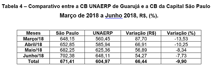 Metodologia - O levantamento da Cesta Básica CB Unaerp é feito pela equipe do Núcleo de Pesquisas Fernando Eduardo Lee da Universidade Unaerp Guarujá, sob coordenação do economista e pesquisador Prof. Dr. Rubens Ulbanere. A pesquisa leva em consideração 39 produtos comercializados em estabelecimentos na região central de Guarujá e do distrito de Vicente de Carvalho, com base na metodologia utilizada pela parceria Procon/Dieese, e faz comparação com os indicadores da capital paulista.