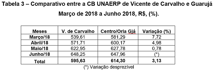 Pesquisar para economizar - Na comparação de preços no comércio local, no segundo trimestre de 2018, o valor médio da CB de Guarujá/Centro custou R$ 614,30, mais caro que no Distrito de Vicente de Carvalho, que registrou valor de R$ 595,63. A diferença nesse período foi de 3,13%.