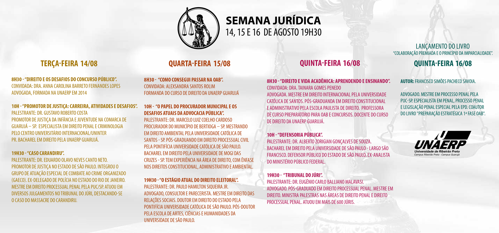 A programação terá a presença de palestrantes convidados em dois horários, às 10h e às 19h30, que irão discorrer sobre temas atuais. Dentre os palestrantes convidados estão o promotor de justiça Eduardo Olavo Neves Canto Neto, que falará sobre o Caso Carandiru; o advogado Paulo Hamilton Siqueira Júnior, que abordará o Direito Eleitoral; o advogado Eugênio Carlo Balliano Malavasi, que atuou em mais de 600 júris, o defensor público Alberto Zorigian Gonçalves de Souza, que comentará sobre a Defensoria Pública, o promotor de Justiça de Guarujá, Gustavo Roberto Costa, e procurador municipal de Bertioga, Marcelo Luiz Coelho Cardoso.