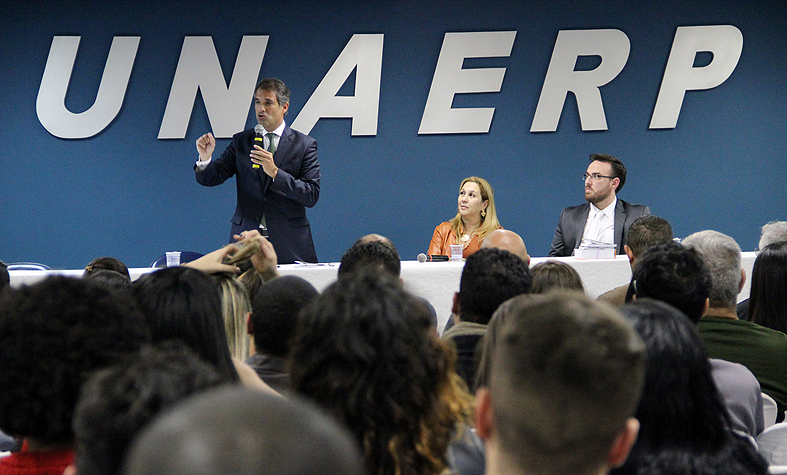 Em seguida, o promotor de Justiça da Vara da Infância e Juventude, Gustavo Roberto Costa, explicou sobre as atribuições do ministério público e o papel do promotor de justiça. “É uma profissão gratificante porque a gente pode atuar para defender interesses que muitas vezes são esquecidos”. Formado na Unaerp Guarujá, ele se sente contente em falar aos estudantes. “Sou muito grato pelo que a Universidade me proporcionou e também para incentivar os alunos, mostrar o caminho que os espera.” A advogada e também ex-aluna da Unaerp, Anna Carolina Barreto Fernandes Lopes, explanou em um dos painéis sobre sua rotina de estudos diários para concursos públicos.