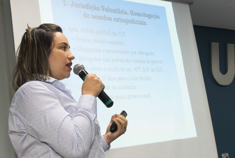 A programação da Semana Jurídica teve início no último dia 14 de agosto, com palestras nos períodos da manhã e noite. A Reforma Trabalhista foi abordada pela juíza substituta do trabalho no Tribunal Regional do Trabalho da 2ª Região, Samantha Fonseca Steil Santos e Mello. Ela comentou que a nova norma modificou sensivelmente a CLT - Consolidação das Leis Trabalhistas. “Por exemplo, uma questão bastante sensível é o acesso do trabalhador ao judiciário, na medida em que as perícias passaram a ser custeadas pelos trabalhadores, que é objeto de algumas ações no Supremo Tribunal Federal”.