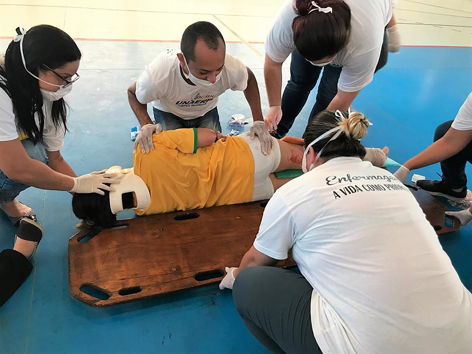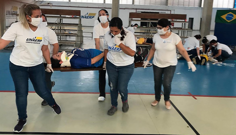 A cena é uma das simulações realísticas promovidas recentemente pelo curso de Enfermagem da Unaerp Guarujá. Os estudantes da 6ª etapa puderam vivenciar os procedimentos de atendimentos em catástrofes e acidentes graves, atuando como socorristas e vítimas, permitindo a prática de protocolos de atendimento pré-hospitalar.