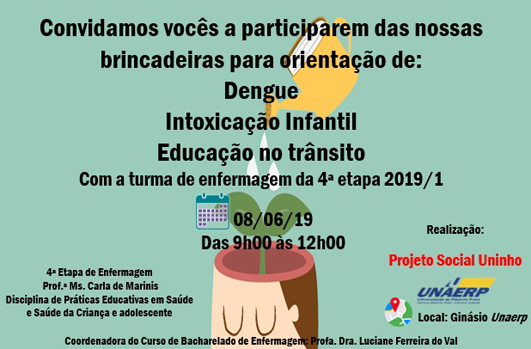 A atividade é gratuita, acontecerá no Ginásio da Universidade, das 9 às 12h, e integra o projeto social Uninho. O evento envolve as disciplinas de "Práticas Educativas em Saúde" e "Saúde da Criança e Adolescente", ministradas pela Profa. Ms. Carla de Marinis.