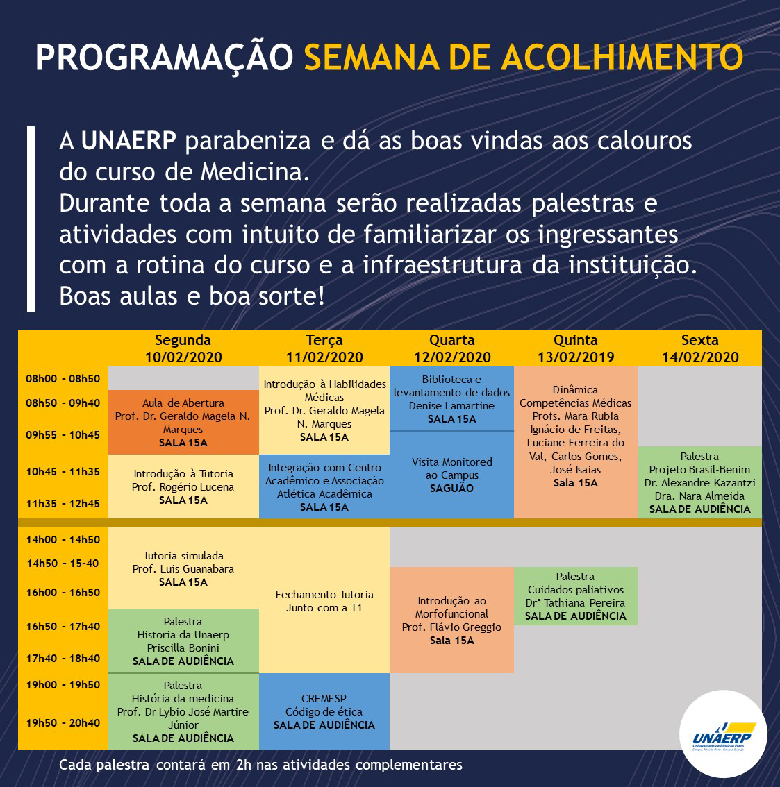 A aula de abertura será realizada na manhã de segunda-feira, dia 10, ministrada pelo coordenador da Faculdade de Medicina de Guarujá, Prof. Dr. Geraldo Magela Nogueira Marques. Ainda na segunda, a pró-reitora da Unaerp Guarujá, Profa Priscilla Bonini Ribeiro, fará palestra às 17h sobre a História da Unaerp, e às 19h, o fundador da Sociedade Brasileira de História da Medicina, Lybio José Martire Junior, irá palestrar sobre a história da Medicina.
