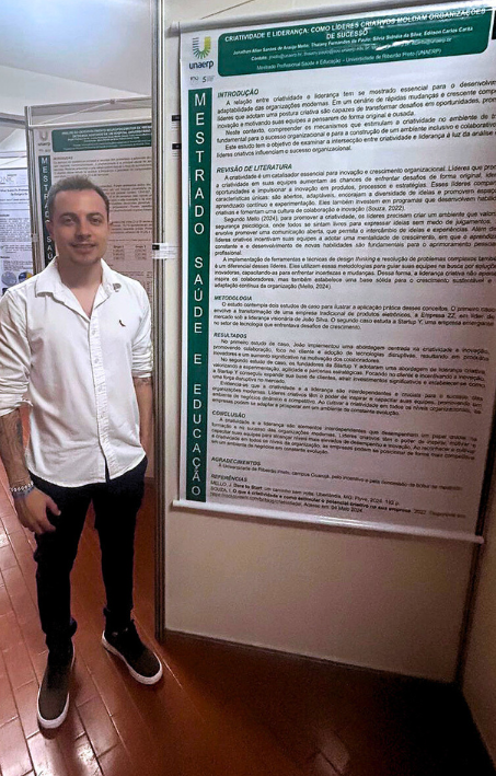 Jonathan Mello, que é estudante de mestrado profissional em Saúde e Educação, apresentou no painel os resultados do trabalho científico “Criatividade e liderança: Como líderes criativos moldam organizações de sucesso”, que fez em co-autoria com Thaiany Fernandes de Paulo e com os professores Silvia Sidnéia da Silva e Edilson Carlos Caritá.