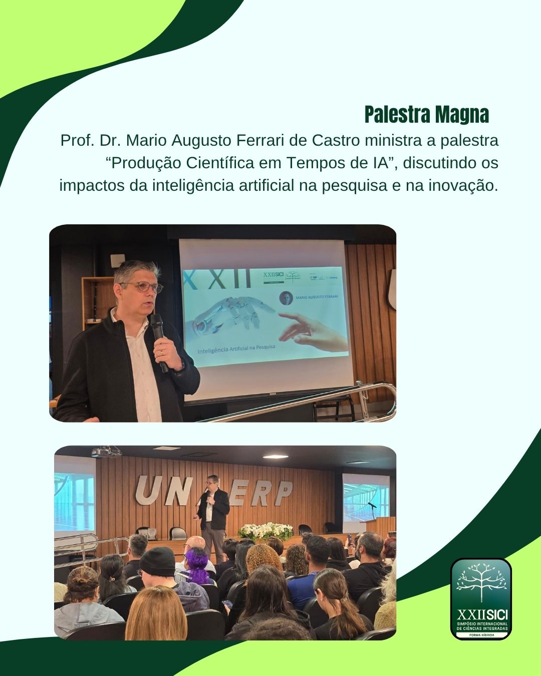 A palestra magna, “Produção Científica em Tempos de IA”, foi ministrada pelo Prof. Dr. Mario Augusto Ferrari de Castro. Médico cirurgião de cabeça e pescoço, livre docente e especialista em Docência e Preceptoria, com MBAs em Inteligência Artificial, Gestão Acadêmica e Administração Universitária, Castro é entusiasta pela inovação no ensino da saúde e pelo impacto da Inteligência Artificial na educação médica.
