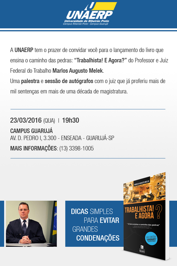 Lançamento do livro "Trabalhista! E Agora" do Prof. e Juiz Federal do Trabalho Marlos Augusto Melek