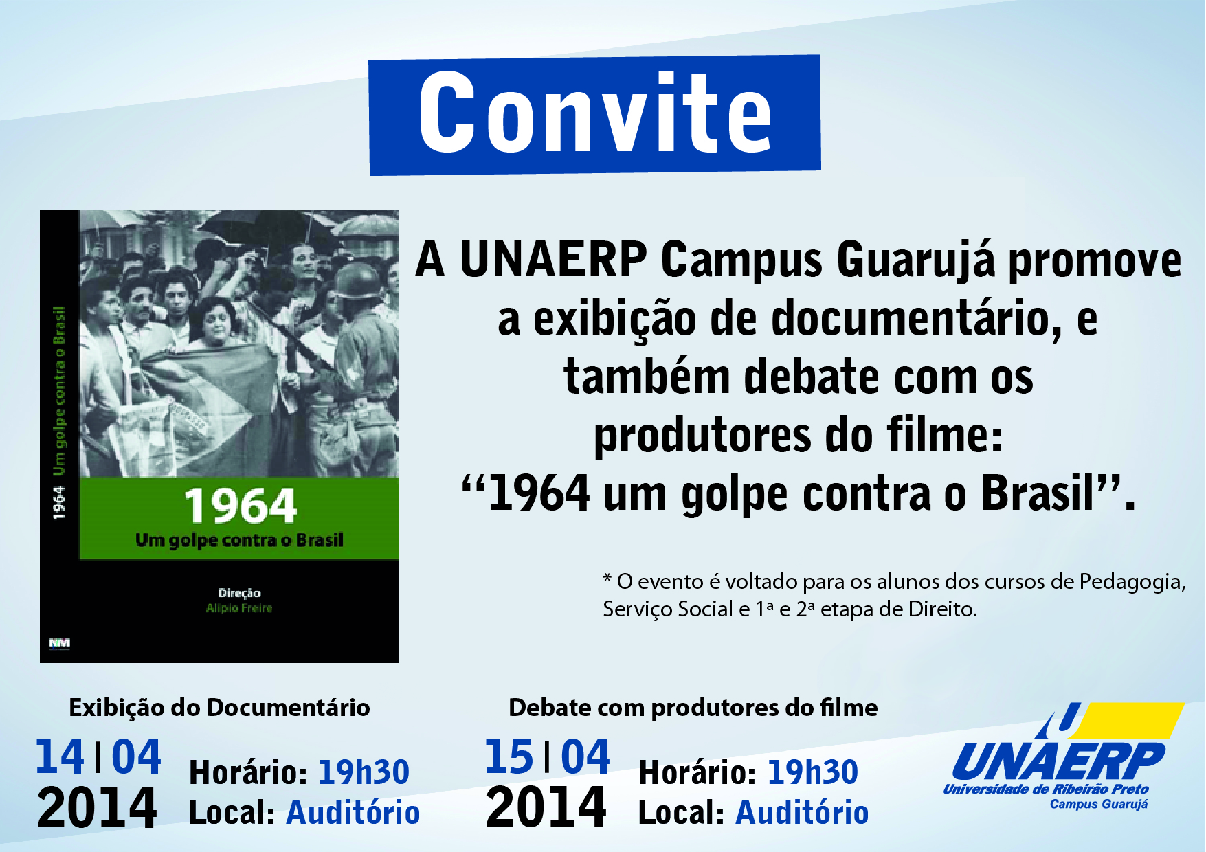A Universidade de Ribeirão Preto – UNAERP Campus Guarujá promoveu entre os dias 14 e 15 de abril, um debate acerca do documentário “1964 UM GOLPE CONTRA O BRASIL”. A atividade contou com a participação...