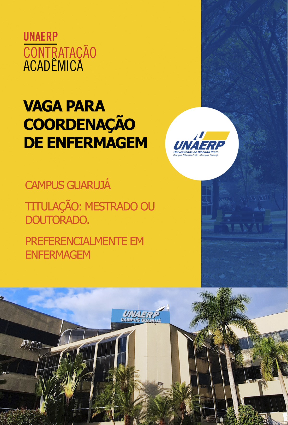 Curso de Enfermagem da Unaerp Campus Guarujá abre Processo Seletivo para contratação de Coordenador(a)Os(as) interessados(as) deverão encaminhar uma cópia do Currículo Lattes por email até o dia 10/06/2022. Saiba mais.