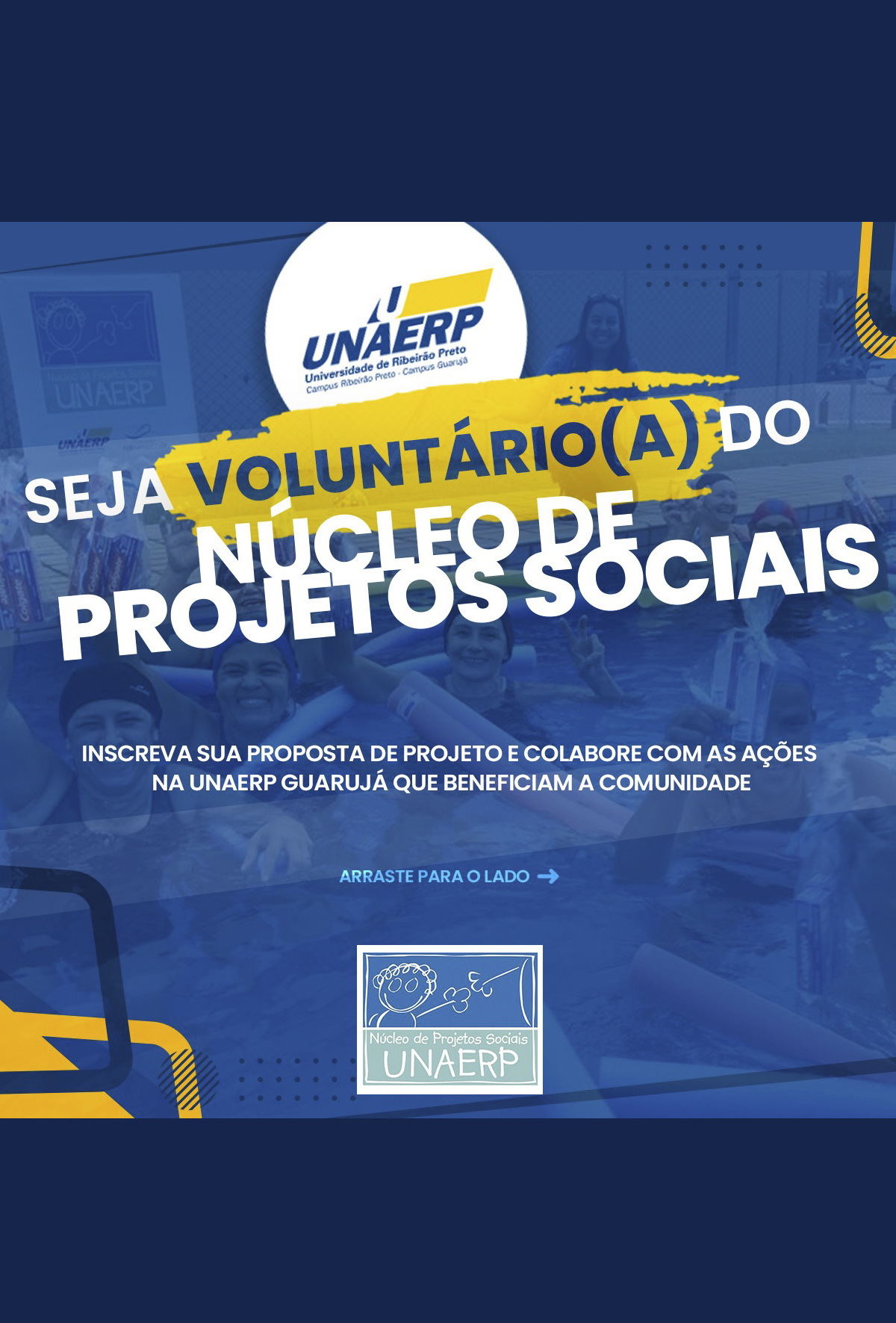 Chamada interna recebe inscrições de propostas para projetos sociaisSeja voluntário do Núcleo de Projetos Sociais da Unaerp Guarujá
