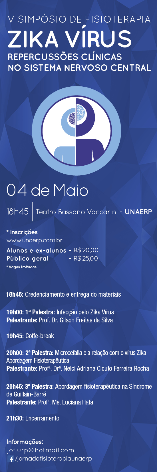 Com o tema Zika Vírus - Repercussões Clínicas no Sistema Nervoso Central, o V Simpósio de Fisioterapia da Unaerp será realizado no dia 4 de maio, a partir das 18h45, no Teatro Bassano Vaccarini.