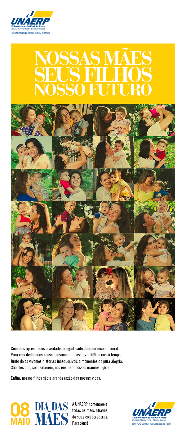 Para homenagear em um dia especial, o Dia das Mães, a Unaerp representou todas elas com imagens de professoras e colaboradoras da Universidade, com seus filhos.