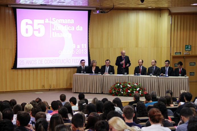Com o anfiteatro lotado por estudantes e profissionais da área do Direito, a cerimônia teve início com a apresentação dos membros da mesa e execução do Hino Nacional.