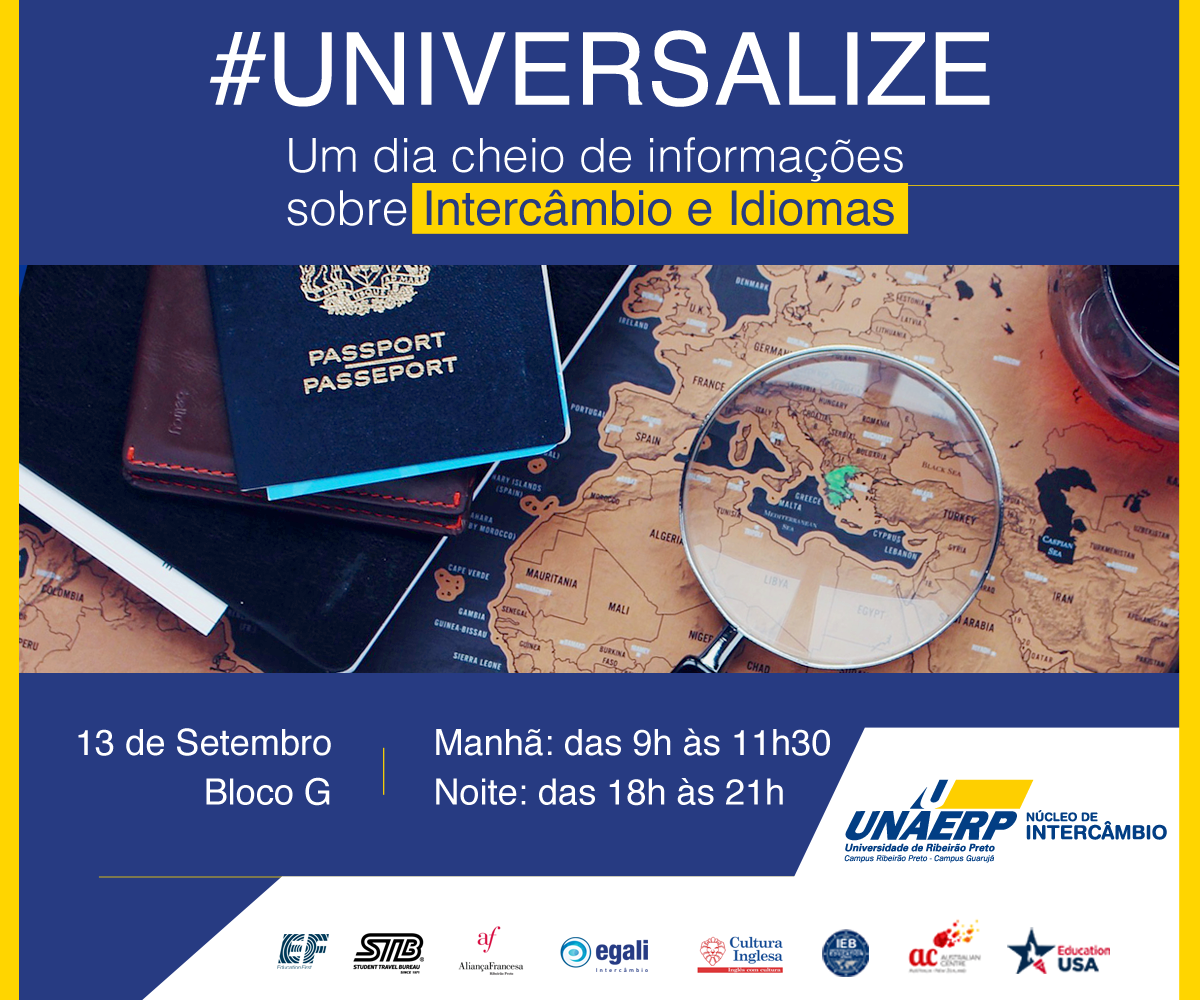 O Núcleo de Intercâmbio da Unaerp realizará no próximo dia 13 de setembro o evento #UNIVERSALIZE, das 9h às 11h30 e das 18h às 21h, no corredor do Bloco G, próximo ao Instituto de Línguas Estrangeiras - ILE.