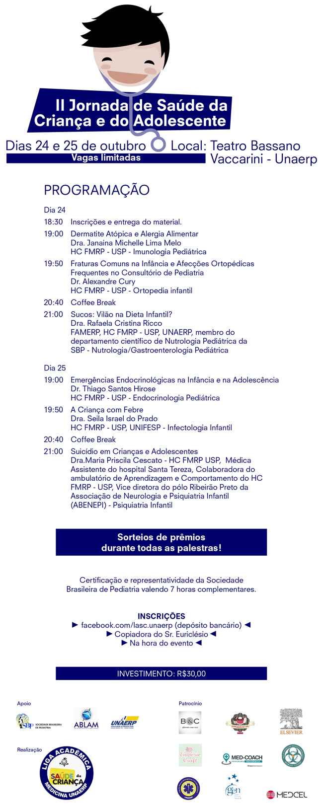 A Liga Acadêmica Saúde da Criança, do curso de Medicina da Unaerp, realiza nos próximos dias 24 e 25 de outubro a II Jornada da Saúde da Criança e do Adolescente, no Teatro Bassano Vaccarini.