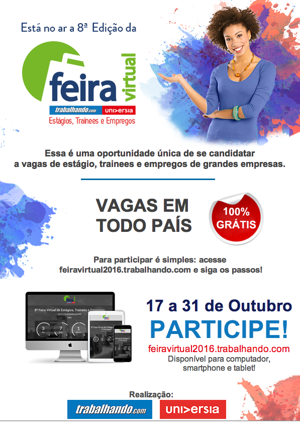 Acontece entre os dias 17 e 31 de outubro a 8ª Edição da Feira Virtual, evento que oferece, gratuitamente, a oportunidade de cadastro em vagas de estágios, trainees e empregos em grandes empresas.