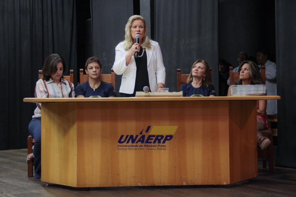 A mesa da solenidade foi composta pela coordenadora de Pesquisa e Pós-Graduação Stricto Sensu da Unaerp e coordenadora do Conic, professora Neide Aparecida de Souza Lehfeld; a coordenadora de Graduação da Diretoria de Ensino Pesquisa e Extensão da Unaerp, professora Sonia Maria Camargo dos Santos; a coordenadora de Extensão da Diretoria de Ensino Pesquisa e Extensão da Unaerp, professora Carmen Silvia Gonçalves Lopes; a coordenadora do Comitê de Ética em Pesquisa da Unaerp e apoio da coordenação do Conic, professora Luciana Rezende de Oliveira; a coordenadora do programa de Mestrado e Doutorado em Odontologia da Unaerp, professora Yara Correia Silva Souza, e a coordenadora do programa de Mestrado em Saúde e Educação da Unaerp, professora Silvia Sidneia da Silva.
