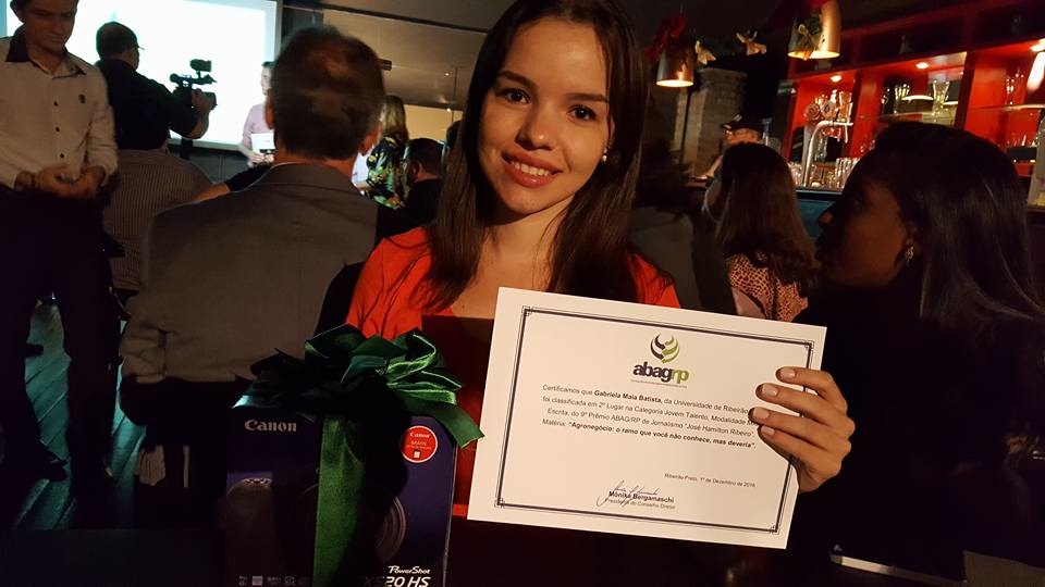 A aluna Gabriela Maia Batista, da 8ª etapa do curso de Jornalismo da Unaerp conquistou o 2º lugar do Prêmio ABAG/RP de Jornalismo 2016, categoria Jovem Talento, modalidade escrita, no último dia 01 de dezembro.