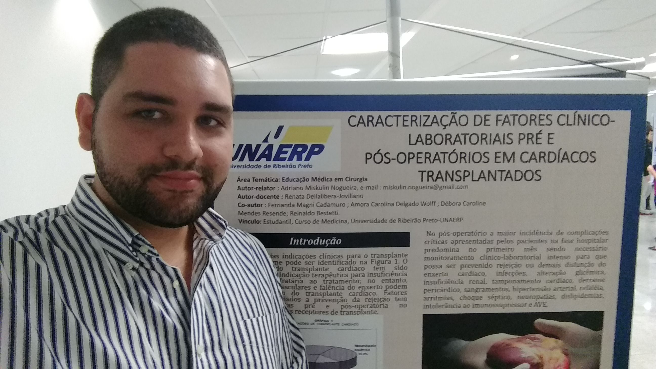 O aluno do curso de Medicina da Unaerp, Adriano Miskulin Nogueira, apresentou o trabalho "Caracterização de Fatores Clínicos-Laboratoriais Pré e Pós-Operatórios em Cardíacos Transplantados" no III Congresso Nacional da Associação Brasileira das Ligas Acadêmicas de Cirurgia (ABLAC), realizado dos dias 26 a 28 de janeiro, em São Paulo. Adriano foi o representante de seu grupo, formado pelos alunos Fernanda Magni Cadamuro, Amora Carolina Delgado Wolff e Débora Caroline Mendes Resende . "Foi uma grande honra saber que um trabalho do qual participei na execução foi aprovado e apresentado num congresso tão reconhecido como a ABLAC. Só tenho a agradecer aos orientadores e aos colegas", conta uma das alunas envolvidas, Fernanda Cadamuro.