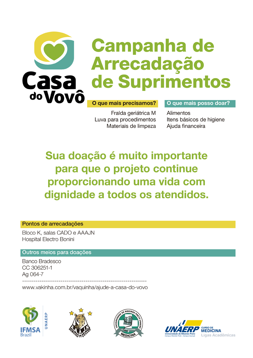 As Ligas Acadêmicas da Medicina, juntamente com a Atlética (AAAJN), Centro Acadêmico (CADO) e IFMSA-UNAERP, promovem uma campanha de arrecadação de suprimentos para a Casa do Vovô, entidade que atende 83 idosos em situação de vulnerabilidade social em Ribeirão Preto. As doações podem ser feitas até o dia 04/05 nas salas do CADO e da AAAJN, no bloco K e na recepção do Hospital Eletro Bonini.