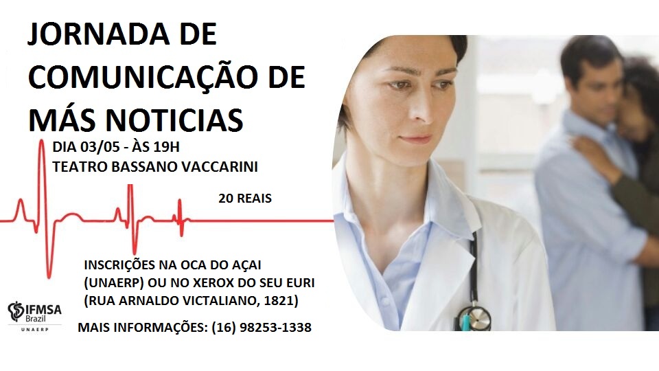 O comitê da International Federation of Medical Students Association (IFMSA) do curso de Medicina da Unaerp realizará na próxima quarta-feira, 03 de maio, a "Jornada de Comunicação de Más Notícias", no Teatro Bassano Vaccarini.