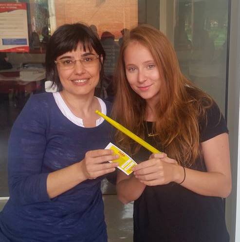 Professora Daniela Tincani entrega ingresso para a aluna de Direito, Tassiane Del Sant, que achou a baqueta e ganhou o ingresso pelo segundo ano consecutivo