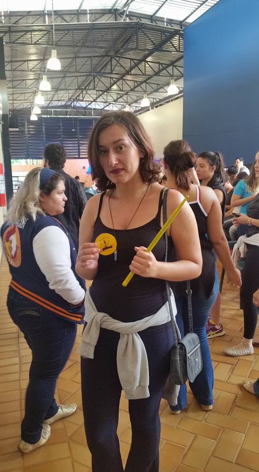 A estudante de Fisioterapia, Sâmela Aguilar, com o objeto que trocou pela baqueta: "Fui comprar o ingresso e tinha acabado, mas agora vou poder ir no João Rock"