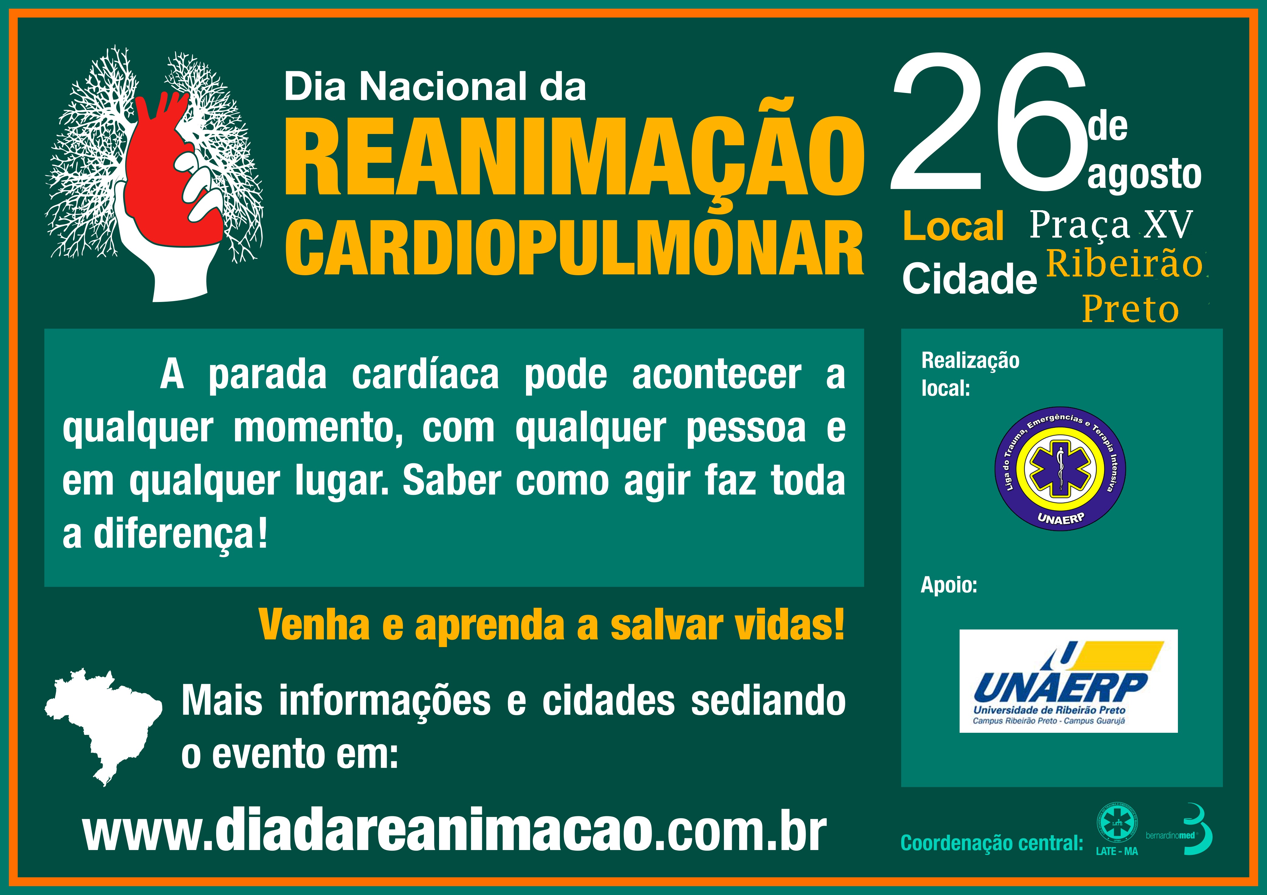 A Liga do Trauma, Emergências e Terapia Intensiva do curso de Medicina da Unaerp - LITETI, comemora no próximo dia 26 de agosto, o Dia Nacional da Reanimação Cardiopulmonar, com uma ação na Praça XV de Novembro - calçadão de Ribeirão Preto, das 08 às 12h.