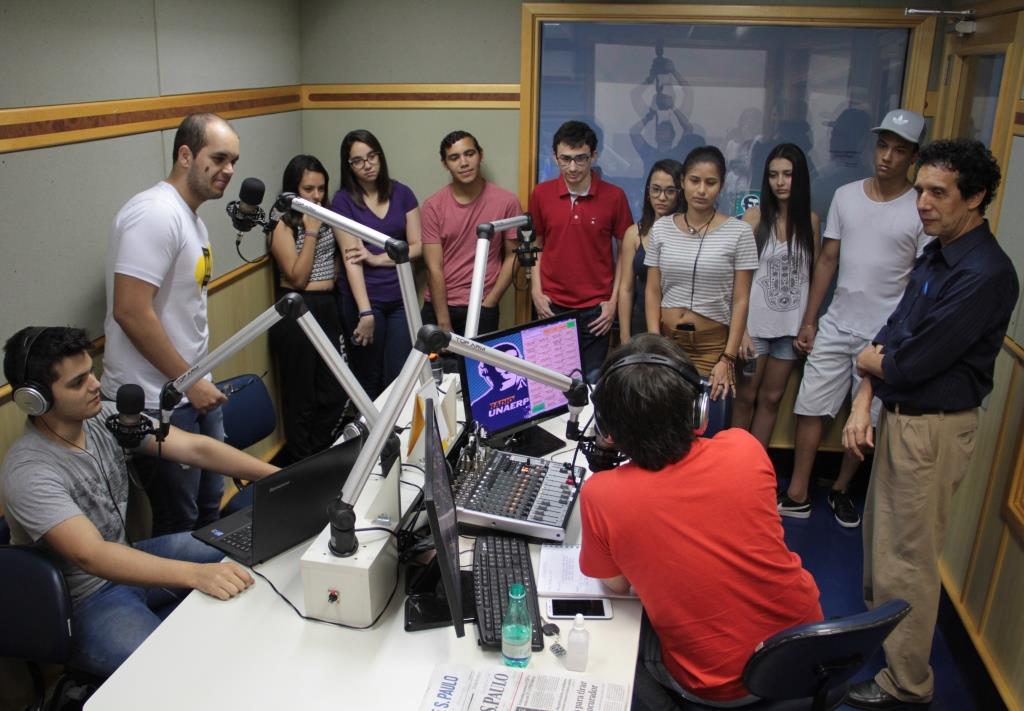 Estudantes conhecem a Rádio Unaerp, acompanhados do coordenador do curso, professor Gil Santiago (em pé, primeiro à direita)