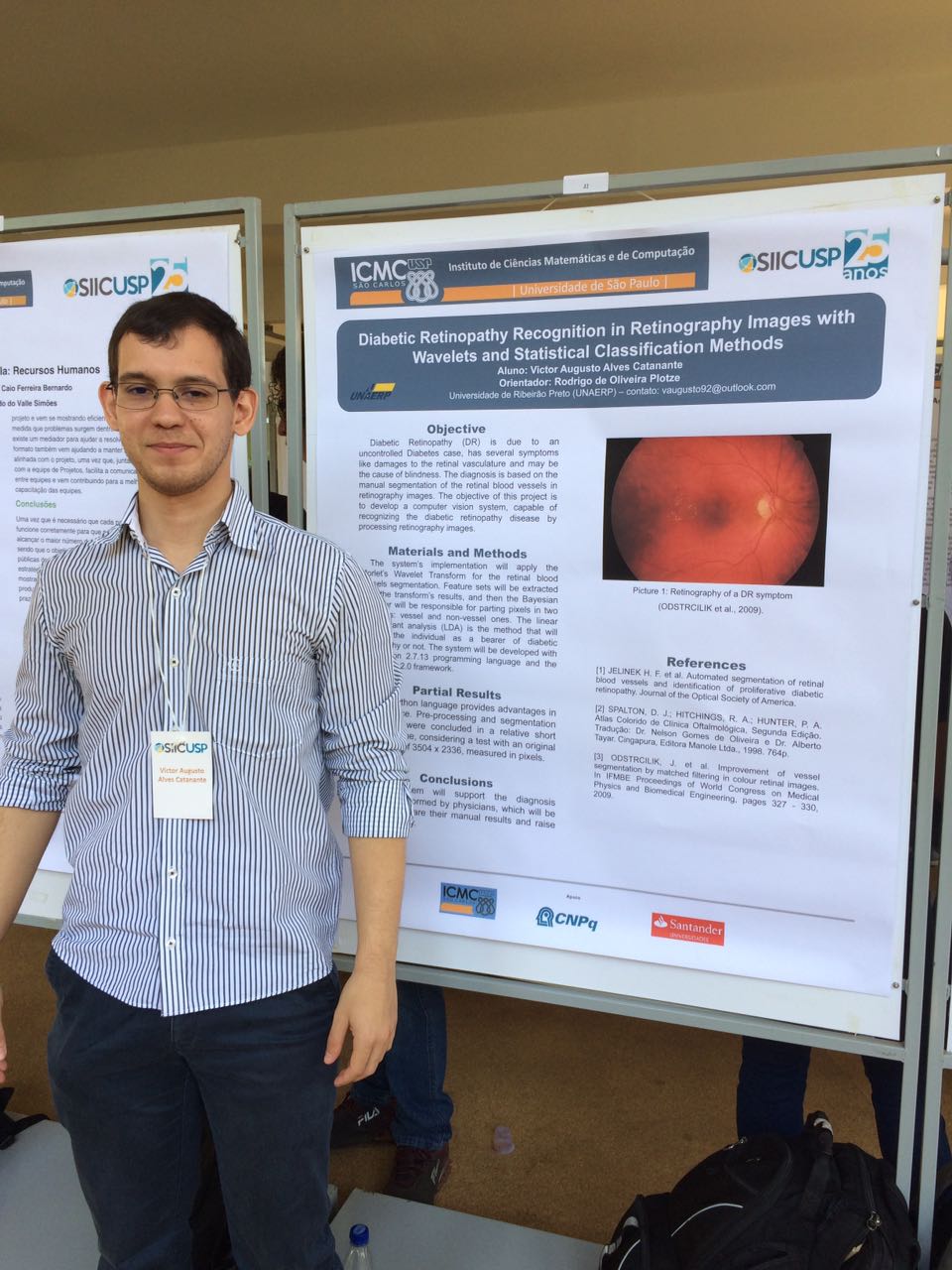 Com a orientação do professor Rodrigo Plotze, Victor apresentou o trabalho "Diabetic Retinopathy Recognition in Retinography Images With Wavelets and Statistical Classification Methods" e Gabriela participou com o trabalho "Sistema de Autenticação Baseado em Reconhecimento Facial".