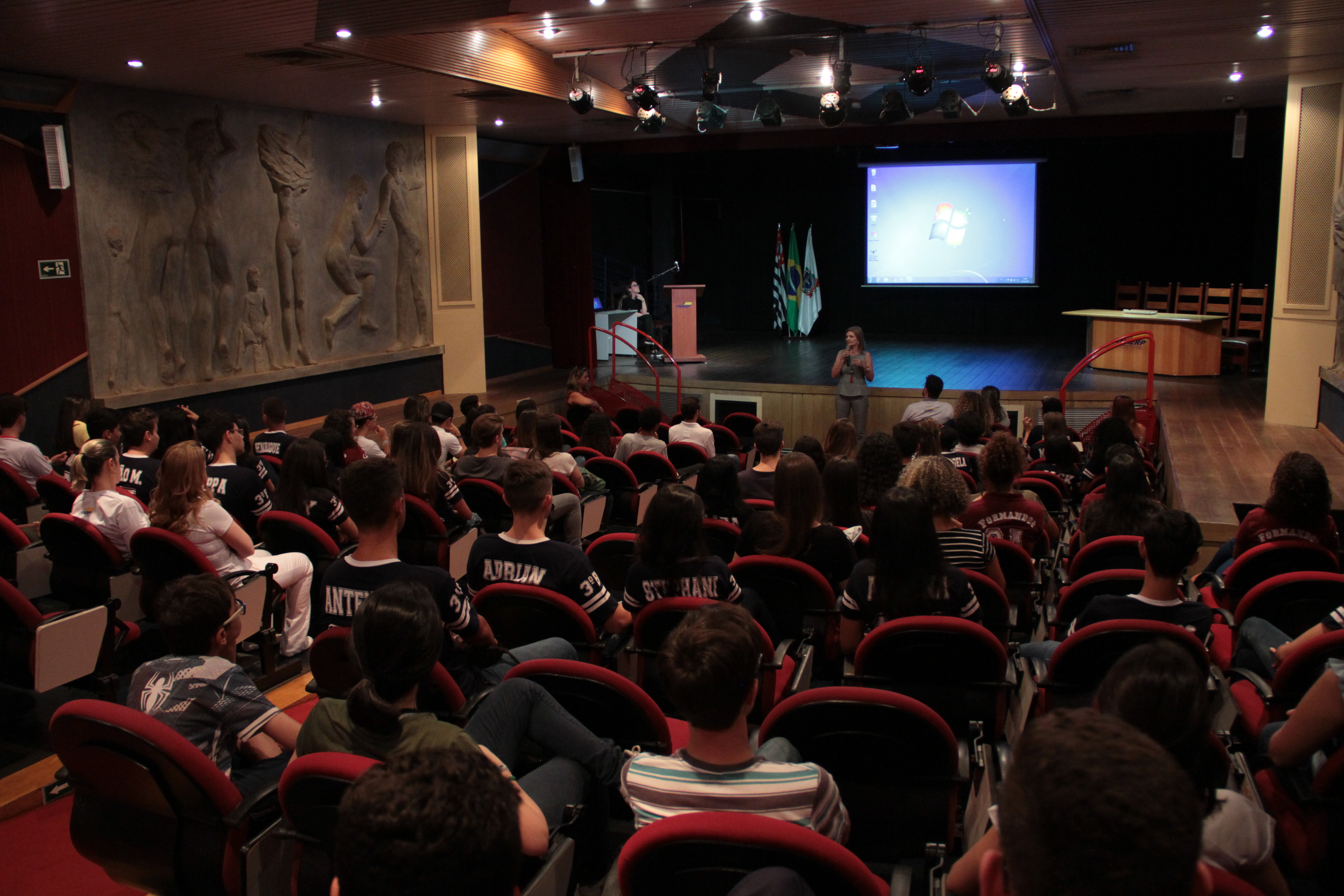 Recepção dos alunos no Teatro Bassano Vaccarini pela coordenadora da Diretoria de Ensino, Pesquisa e Extensão da Unaerp, Sônia Maria Camargo dos Santos