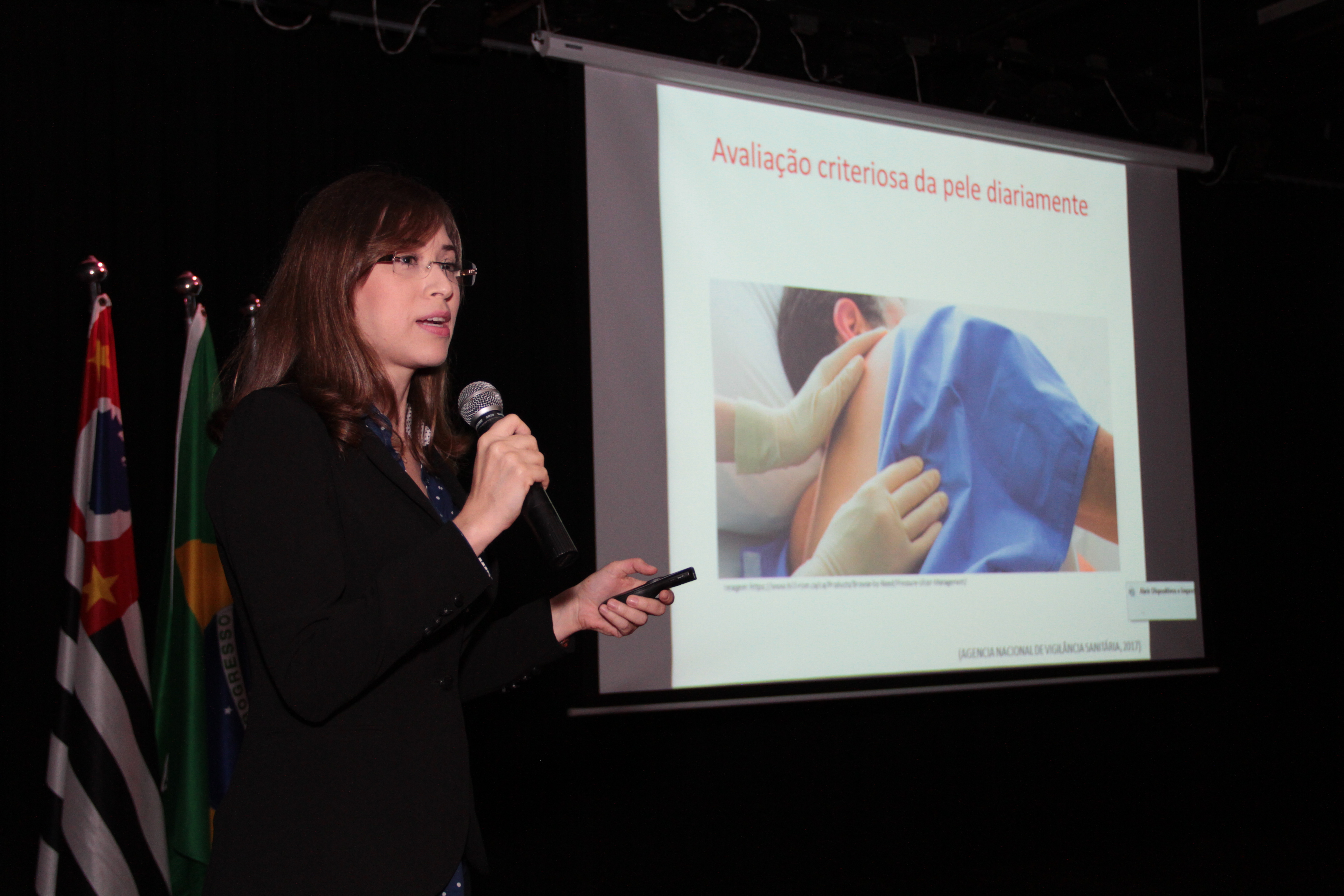 A palestra "Cuidados gerais e úlcera de pressão" ministrada pela enfermeira Thamiris Ricci de Araújo, deu início ao Simpósio e tratou dos cuidados de enfermagem com o paciente que sofre com o problema. A úlcera de pressão é a lesão que acomete as partes moles ou a pele do paciente por manter-se um longo período de tempo na mesma posição. Segundo Thamiris, o tema é de extrema relevância, pois é um problema que causa impacto financeiro para as instituições e impacto emocional para os pacientes, além de provocar uma incidência muito grande de óbitos. "A lesão por pressão é um problema que possui vários fatores envolvidos, tanto intrínsecos, que estão relacionados ao paciente em si, e extrínsecos relacionados à exposição do paciente. Tem alguns casos que são inevitáveis, mas na maioria é possível prevenir o desenvolvimento dessa lesão", complementa.