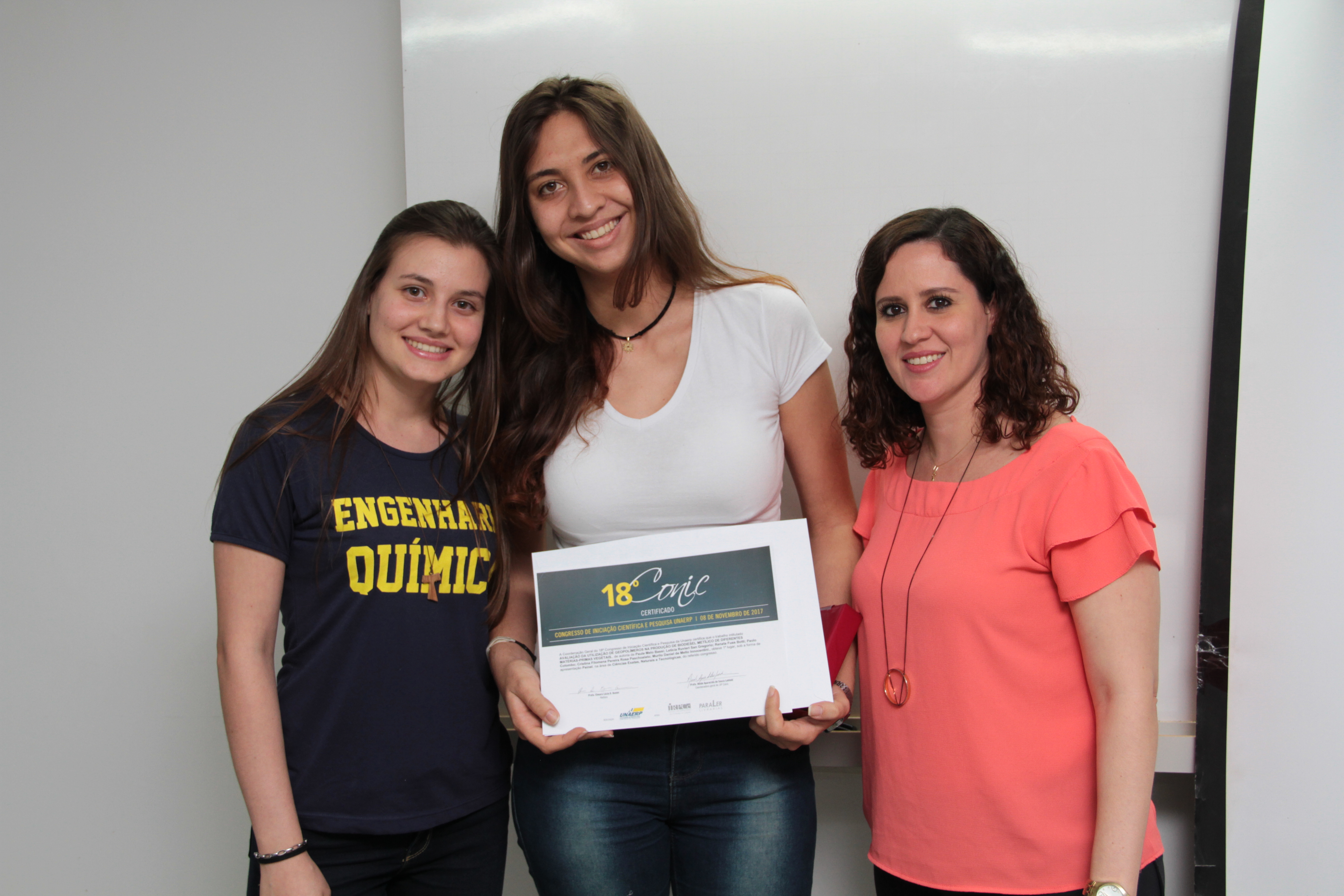 Primeiro lugar - Trabalho: "Avaliação da utilização de geopolímeros na produção de biodiesel metílico de diferentes matéria-primas vegetais". Autora: BASSI, P. M. Co-autores: BOTTI, R. F; COLOMBO, P; GREGÓRIO, L. R. S. e PASCHOALATO, C. F. P. R. Orientador: INNOCENTINI, M. D. M.