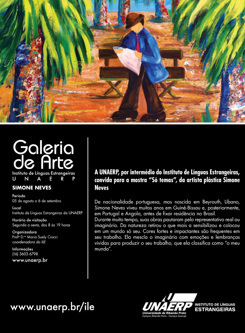 A Unaerp, por intermédio do Instituto de Línguas Estrangeiras (ILE), recebe em sua Galeria de Artes, até o dia 06 de setembro, a mostra “Só temas” da artista Simone Neves. A exposição pode ser conferida gratuitamente de segunda a sexta-feira, das 08h às 19h. Confira mais informações no convite ou ligue (16) 3603-6798.